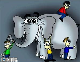 هندوان برای نمایش، فیلی را در شهری آوردند که مردمانش هرگز چنین حیوانی ندیده بودند . فیل در خانه ای تاریک بود ومردمان بسیاری برای دیدنش به تاریکی رفتند ،چون دیدنش با چشم ممکن نبود،هرکس گوشه ای از حیوان را لمس می کرد و هنگامی که از او درباره شکل فیل می پرسیدند به خراخور درک خویش از فیل ،چیزی می گفت،آنکه دستش به خرطوم حیوان رسیده بود گفت: فیل همچون ناودان است و آنکه گوش فیل را لمس کرده بود حیوان را مثل باد بزن معرفی می کرد،نفر سوم که در آن تاریکی دست بر پای فیل سوده بود در پاسخ به شکل فیل ،آن را به ستون مانند کرد و نفر دیگر نیز گفت فیل همچون تخت است ، چرا که او پشت فیل را لمس کرده بود ،به همین ترتیب دیگر مردمان که وصف فیل را از اینان می شنیدند،در نهایت به سردرگمی و اختلاف مبتلا می شدند ،اختلاف میان آنان تفاوتی اندک نبود بلکه اختلاف میان شکل الف ودال بود،اگر هریک از آنان که به دیدن فیل رفته بوده اند،شعمعی در دست داشتند دیگر نظرشان چنین متفاوت نبود.